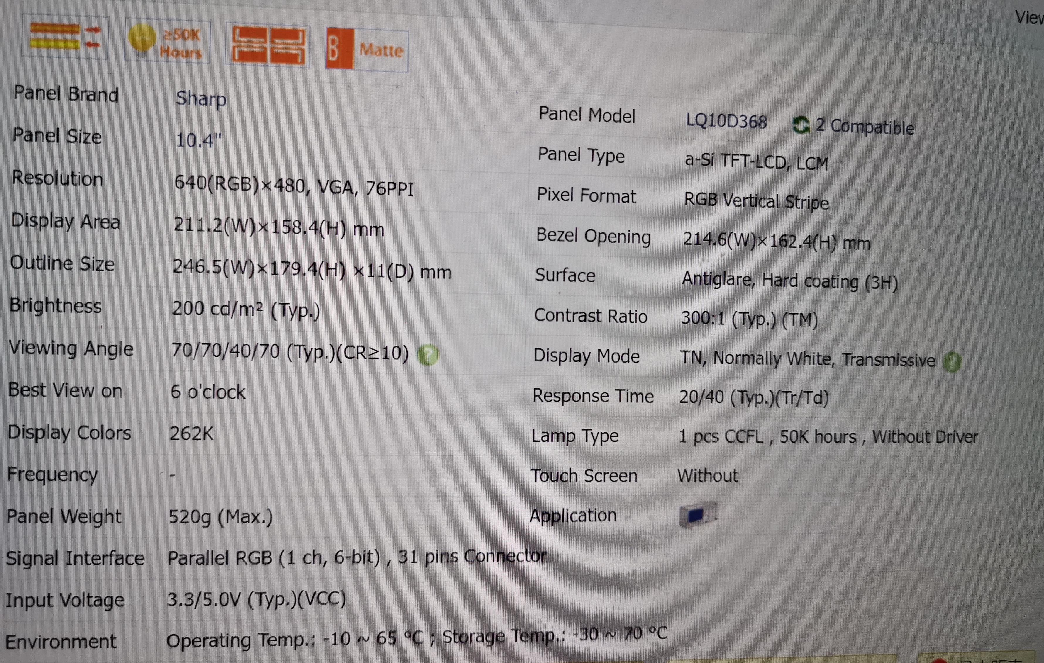 LQ10D368 is a 10.4" diagonal a-Si TFT-LCD display panel product from Sharp Corporation (hereafter called Sharp), with an integral CCFL backlight system, without backlight driver, without touch screen. It features an operating temperature range of -10 ~ 65°C , a storage temperature range of -30 ~ 70°C , and the maximal vibration level of 1.0G (9.8 m/s²). It's general features are summarized by einklcd in the following: Lamp Repaceable, Life ≥ 50K hours, U/D,L/R Reverse, Matte . Based on its features, einklcd recommend that this model be applied to Industrial etc. According to the information stored in einklcd this model mass production on Q3, 2000 and last shippment on Q3, 2009, Now this model is discontinued. We inputted this model's specification on Jan 10 2013 for the first time, and the latest update on Jul 3 2020. If you want to embed the LCM in your future product, einklcd strongly recommend that you should contact with Sharp or it's agent to learn lateast production and specification detail of LQ10D368. The production status marked on einklcd.com is for reference only and should not be used as the basis for the user's decision making.